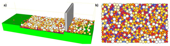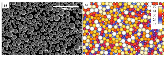 The powder particles are seen clearly in Figure 1. According to the SEM image in Figure 1a, the real powder particle may be interpreted as round in a reasonable approximation. The particle sizes were known to be consistent with the experiment computation, and the particle sizes were found to be consistent with D10, D50, and D90 in the appropriate proportions (see Figure 1). Figure 1b depicts the particle that was created using the simulation.