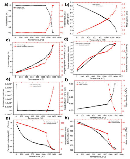 Temperature-dependent properties: (a) solid state to liquid state, (b) density and molar volume, (c) average expansion coefficient and volume change, (d) electrical resistivity and thermal conductivity, (e) total viscosity and liquid diffusivity, (f) Poisson’s ratio and liquid viscosity, (g) electrical conductivity and young’s modulus, and (h) bulk modulus and shear modulus.