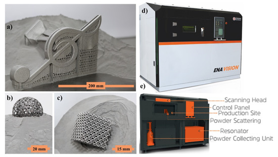Figure 4a–c shows a printed specimen. Figure 4d depicts the ENAVISION 250 LPBF system that was used for validation. The equipment breakdown is shown in Figure 4e. General specifications for ENAVISION 250 LPBF system have been provided in Table 3.
