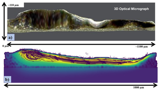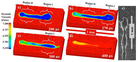 Figure 5a–d shows the melt pool dynamic viscosity at 200, 270, 300, and 400 µs, respectively, and Figure 5e shows the experimental comparison through the SEM of the irradiated single track.