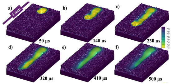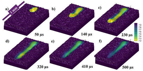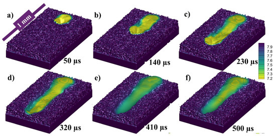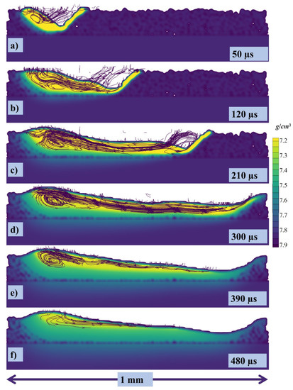 The top view of the same single track can be seen in Figure 8a–f at 40, 130, 220, 310, 400, and 490 µs, respectively, where the color gradient is showing the density of the melt pool.