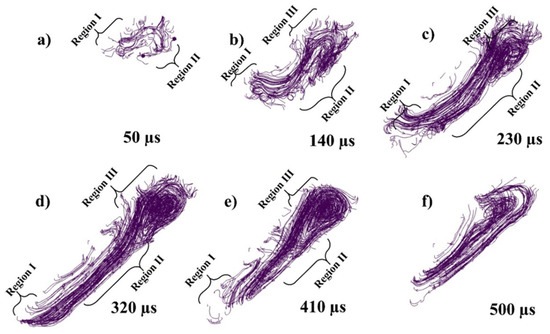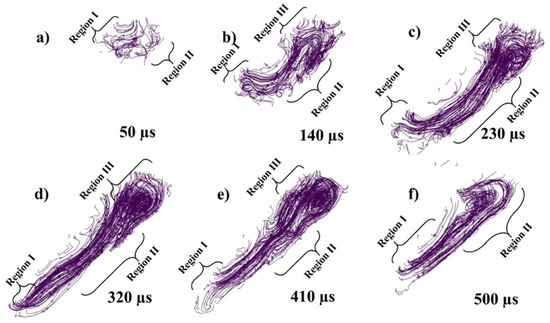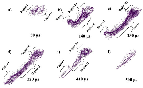Stream traces of the cross-section at (a) 50, (b) 120, (c) 210, (d) 300, (e) 390, (f) 480 µs.