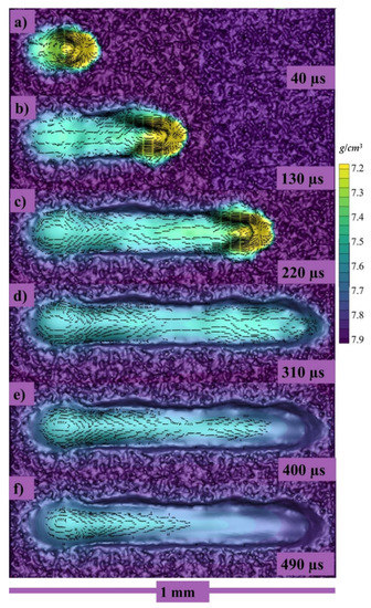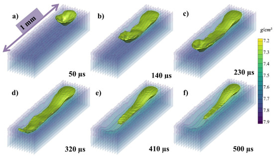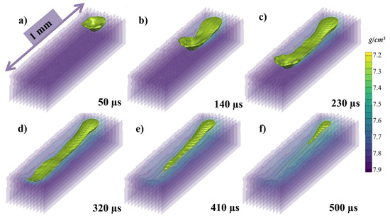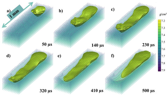 Figure 6a–f presents the state of the melt pool at 50, 140, 230, 320, 410, and 500 µs, respectively, with respect to the density of the material. Because the depression zone is constantly heated, the flow from higher temperatures fluid (with lower density) continues to flow. However, as the melted metal has a greater temperature (low density) than those at the top of the melt pool, it rises up owing to buoyancy throughout backward transmission and creates a vortex at the rear edge of the melt pool, as illustrated. To make things easier to explain, the density color gradient has been presented in Figure 6.