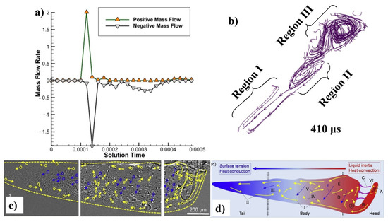 (a) Mass flow rate forward and backwards, (b) flow streams at 410 µs, (c) X-ray synchrotron imaging of melt pool [27], and (d) schematics of melt pool from the same [27].