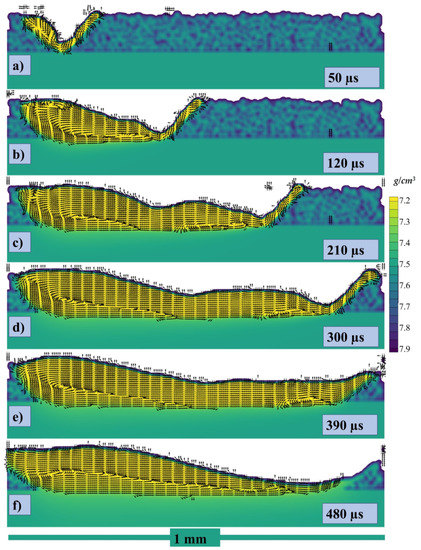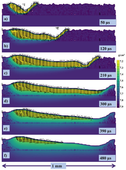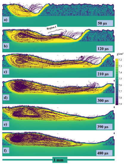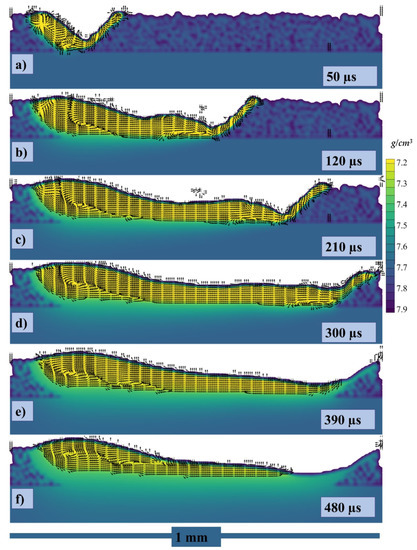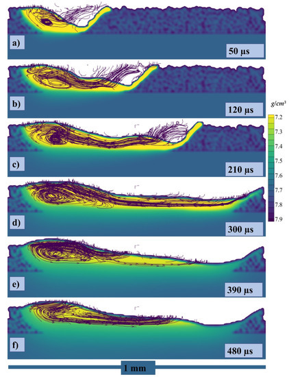 The cross section has been taken with velocity vectors of each point within the melt pool and can be seen in Figure 12a–f at 50, 120, 210, 300, 390, 480 µs, respectively.