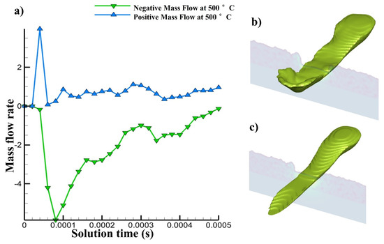 The cross section in the middle of the melt pool in lateral direction has been taken with stream traces and can be seen in Figure 10a at 50, 120, 210, 300, 390, and 480 µs, respectively, where the color gradient is showing the density of the melt pool. When the laser starts to irradiate the powder particle start to form the melt pool and with the movement of the laser the pool is pushed backwards due to the recoil and Marangoni force as shown in Figure 10a where the stream traces show the path of the melt pool from its initial point in the powder layer. Similarly, when the laser keeps moving further the flow keeps being pulled from the higher surface tension (or relatively lower temperature region) as shown in Figure 10b, and a circular flow pattern starts to appear. The pull force toward the rear end and the circular flow pattern keep on increasing as shown in Figure 10c,d. As the whole single track starts to solidify and cool down, a hump is generated which contributes to the uneven height of the melt pool. The higher concentration of the melt pool causes the rear end to cool down slowly as compared to the region with the lower concentration as seen in Figure 10d. Now, at the end of the single-track cooling, when the melt pool concentrated region has higher temperature and the less concentrated has lower temperature, the liquid metal starts to flow in the opposite direction and this also provides evidence that the Marangoni is the dominating force.