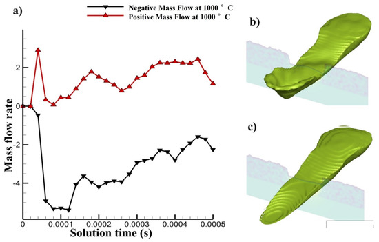 A 2D cross section of the track was obtained, and the amount of liquified metal going forward as well as backward was computed using mass flow rate calculations in order to fully comprehend the mass flow rate, as shown in Figure 9a. It depicts the flow dynamics of the melt pool prior and afterwards laser irradiation. The positive mass flow rate indicates that the flow is moving forward, whereas the negative mass flow rate indicates that the flow is moving backward. A small portion of the melt pool flows forward until the laser is irradiated, but when the laser passes over that area, the melt pool is dragged backwards owing to the difference in surface tension between the two regions. X-ray synchrotron imaging of melt pool in LPBF of Al based alloys using tungsten nanoparticle markers can be seen in Figure 9c, and schematics of melt pool from the mentioned experiments can be seen in Figure 9d.
