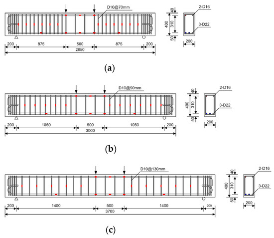 Details of typical specimens [8,9]: (a) B6-2.5b; (b) B6-3.0b; (c) B6-4.0b (unit: mm).