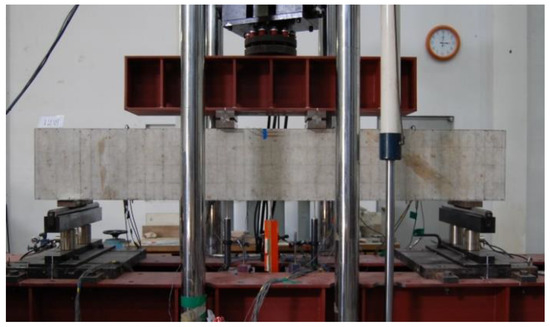 As shown in Figure 3, the cross-sectional width, depth, and effective depth of the specimens were 200 mm, 400 mm, and 350 mm, respectively. The distance between the loading points was 500 mm, and four-point loading was applied to the specimens. To measure the curvature of the specimen and the strain of the materials, wire strain gauges were attached to the tension and compression reinforcing bars and to the concrete extreme compression fiber located at the mid-span of the specimen. As shown in Figure 4, a universal testing machine (UTM) with a capacity of 2000 kN was used for loading, and a LVDT were installed at the bottom of the specimens to measure the mid-span deflection.