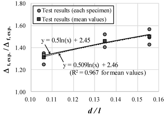 Figure 7 shows the ratio according to presented in Table 2. The circular mark indicates the test result for each of the nine specimens, and the square mark indicates the average value for each series of specimens. Furthermore, is the ratio of the total deflection to the flexural deflection of RC beams. This ratio has the same meaning as in Equation (11) and is an incremental value of deflection due to the effect of shear. The results of the regression analysis using the least-squares method for the mean values of the experimental results for each series are shown as a dotted line in Figure 7. Considering practicality, the deflection incremental factor can be proposed as follows:
