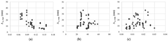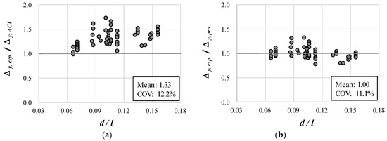 In particular, Figure 9a, which shows the for yield deflection, indicates the ACI 318-19 method underestimates the experimental results more as increases. This is because the ACI 318-19 method considers only the deflection due to flexure. Figure 9b shows the results of predicting the experimental results using Equations (11) and (12) proposed in this study. Figure 9b indicates that, when the proposed method is used, the collected experimental results can be predicted relatively well without being greatly affected by . In particular, as shown in Table 3, the analytical results using the proposed method accurately predicted the experimental results for yield deflection with an average of 1.0 and a COV of 11.1%. Therefore, the proposed method can be used to improve the existing calculation method that considers only the effect of flexure, including the current ACI building code.