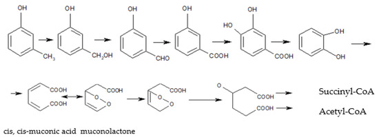 In the natural environment, cresols are formed during lignin and tannin biodegradation [16]. Many phenolic root exudates, including phenolic acids, flavonols, or flavonoids such as procyanidins (PACs), consist of catechin and/or epicatechin units linked by interclavulanic bonds. They have been identified as antimicrobial compounds.They inhibit the activity of gram-negative and gram-positive bacteria, or stimulate the growth of subpopulation-degrading aromatic compounds [17,18]. However, it appears more important to understand the mechanism of catabolic route evolution, which also offers an opportunity to isolate further bacterial strains. Microorganisms are indirectly involved in many catabolic biochemical reactions that initiate this process [19]. The enzymes catalysing these reactions include monooxygenases, such as phenol hydroxylase (MHS) (EC 1.14.13.7) performing the aromatic ring hydroxylation [20], inducible enzymes, derivatives of the cytochrome P-450 with iron ion at various oxidation degrees in the active centre [21] and toluene/o-xylene monooxygenase (ToMO), discovered in the Pseudomonas stutzeri OX1 genome. The key enzymes in the aerobic biodegradation pathway also include dioxygenases, catechol 1,2-dioxygenase or catechol 2,3-dioxygenase, and extradiol enzymes with non-haem Fe(II), thanks to which, phenolic compounds with a methyl group are meta-split, both distally and proximally, to the intermediate products of the Krebs cycle metabolism, such as pyruvate, succinate and acetyl-coenzyme A [22]. An exemplary pathway for oxygen degradation of cresols is presented in Figure 1.