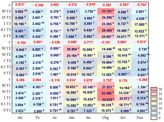 Number of microorganisms in soil contaminated with o-cresol on day 15, 30 and 45 of the experiment (cfu 10n kg−1 DM of soil); Org—organotrophic bacteria (109), Act—actinomycetes (109), F—mold fungi (107), Ps—Pseudomonas sp. (108), Art—Arthrobacter sp. (108), Im—nitrogen-immobilising bacteria (108), Am—ammonifying bacteria (108) and Az—Azotobacter sp. (103). Homogeneous groups are specified in columns, for each group of microorganisms, depending on the increasing doses of o-cresol on T1—15 day, T2—30 day, T3—45 day of the experiment are denoted with letters (a–e), r—Pearson’s linear correlation coefficient, * significant for p = 0.05, n = 14.