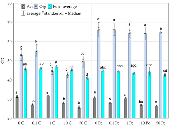 Colony development index (CD) for Org—organotrophic bacteria, Act—actinomycetes and Fun—fungi in soil contaminated with increasing doses of o-cresol during 15, 30 and 45 days of the experiment (average value); Homogeneous groups denoted with letters (a–d) were calculated separately for each group of microorganisms; 0; 0.1; 1; 10; 50—doses of o-cresol (mg kg−1 DM of soil); C—control; and Pc—Perna canaliculus (for abbreviations see Figure 2).