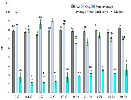 Ecophysiological diversity factor (EP) for Org—organotrophic bacteria, Act—actinomycetes and Fun—fungi in soil contaminated with increasing doses of o-cresol during 15, 30 and 45 days of the experiment (average value); Homogeneous groups denoted with letters (a–f) were calculated separately for each group of microorganisms, 0; 0.1; 1; 10; 50—doses of o-cresol (mg kg−1 DM of soil); C—control; Pc—Perna canaliculus (for abbreviations see Figure 2).