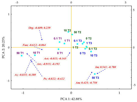 Coefficients of impact (IFPc) of Perna canaliculus on the number of microorganisms in soil contamination with o-cresol—PCA method; the end of the vector of the primary variable: Org—organotrophic bacteria, Act—actinomycetes, F—mold fungi, Ps—Pseudomonas sp., Art.—Arthrobacter sp., Im—nitrogen immobilising bacteria, Am—ammonifying bacteria, Az—Azotobacter sp.; cases: doses of o-cresol mg kg−1 DM of soil: 0; 0.1; 1; 10; 50; time: T1—day 15, T2—day 30, T3—day 45 of the experiment.