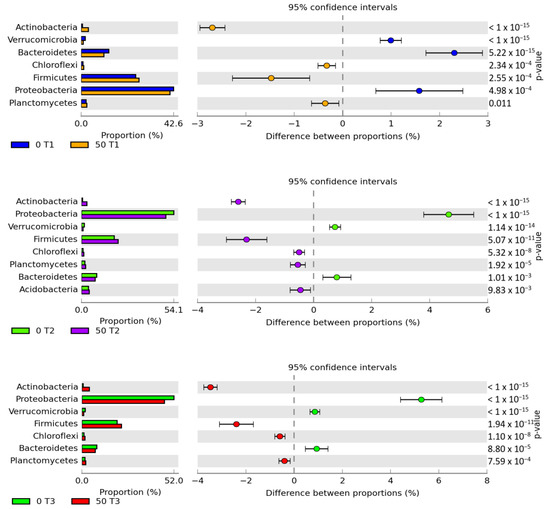 Relative abundance of the dominant bacterial phylum in soil with a difference between proportions ≥1%. A total of 0; 50—doses of o-cresol (mg kg−1 DM of soil); T1—day 15, T2—day 30, T3—day 45 of the experiment.