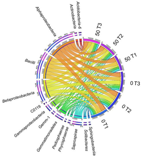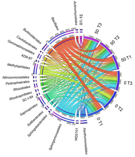 The relative abundance of dominant orders of bacteria in soil with a difference between proportions ≥1%. 0; 50—doses of o-cresol (mg kg−1 DM of soil); T1—15th day, T2—30th day, T3—45th day of research.