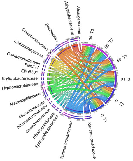 The relative abundance of dominant family of bacteria in soil with a difference between proportions ≥1%. 0; 50—doses of o-cresol (mg kg−1 DM of soil); T1—15th day, T2—30th day, T3—45th day of research.