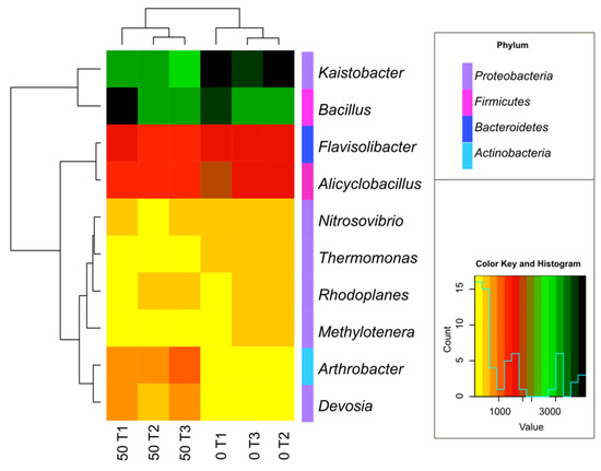 Heat map and associations of the number of bacterial genus in soil with a difference between proportions ≥1%. 0; 50—doses of o-cresol (mg kg−1 DM of soil); T1—15th day, T2—30th day, T3—45th day of the experiment.