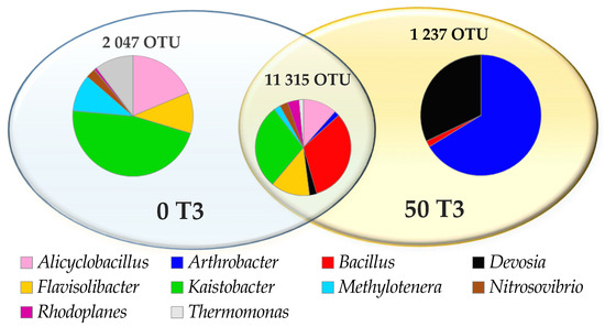 Read of the common operational taxonomic units (OTU) of bacteria ≥1% genus level in the control soil (0 T3) and in soil contaminated with 50 mg o-cresol (50 T3) on day 45 of the experiment.