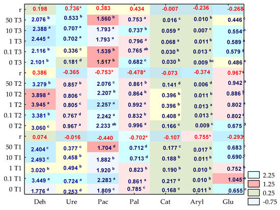Enzymatic activity in soil contaminated with o-cresol on day 15, 30 and 45 of the experiment, (kg−1 DM of soil h−1); Deh—dehydrogenases (μMol TFF); Cat—catalase (Mol O2); Ure—urease (mMol N-NH4); Pal—alkaline phosphatase; Pac—acid phosphatase; Glu—β-glucosidase; Aryl—arylsulfatase (mMol 4-nitrofenol PN). Homogeneous groups are specified in columns for each enzyme, depending on the increasing doses of o-cresol during T1—15 days, T2—30 days, T3—45 days of the experiment and denoted with letters (a–d), r—Pearson’s linear correlation coefficient, * significant for p = 0.05, n = 14.