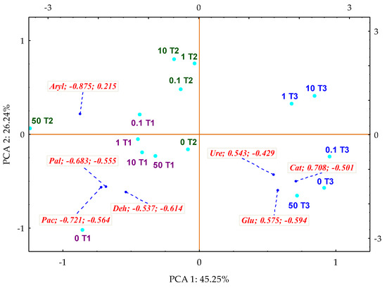 Coefficients of impact (IFPc) of Perna canaliculus for the enzyme activity in soil contamination with o-cresol—PCA method. The end of the vector of the primary variable: Deh—dehydrogenases; Cat—catalase; Ure—urease; Pal—alkaline phosphatase; Pac—acid phosphatase; Glu—β-glucosidase; Aryl—arylsulfatase; —cases: doses of o-cresol mg kg−1 DM of soil: 0; 0.1; 1; 10; 50; T1—day 15, T2—day 30, T3—day 45 of the experiment.