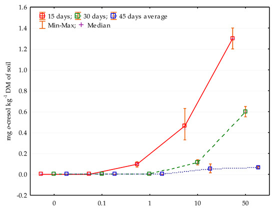 The content of o-cresol in the soil after 15, 30 and 45 days of research depending on o-cresol contamination; 0; 0.1; 1; 10; 50—doses of o-cresol (mg kg−1 DM of soil).