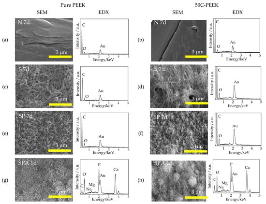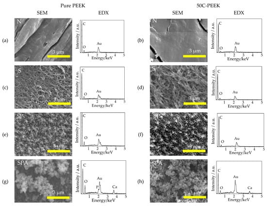 SEM micrographs and EDX profiles on the surfaces of Samples (a,b) N: untreated PEEKs, (c,d) S: sulfuric acid-treated PEEKs, (e,f) SP: sulfuric acid + oxygen plasma-treated PEEKs, and (g,h) SPA: sulfuric acid + oxygen plasma + modified-SBF-treated PEEKs for (a,c,e,g) pure PEEK and (b,d,f,h) 50C-PEEK.