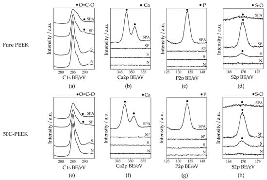 XPS narrow spectra around binding energy of C1s, Ca2p, P2p, and S2p on the surfaces of (a–d) pure PEEK and (e–h) 50C-PEEK.