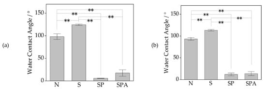 Water contact angles on the surfaces of Samples N (untreated PEEKs), S (sulfuric acid-treated PEEKs), SP (sulfuric acid + oxygen plasma-treated PEEKs), and SPA (sulfuric acid + oxygen plasma + modified-SBF-treated PEEKs) for (a) pure PEEK and (b) 50C-PEEK. The symbol ‘**’ indicates p < 0.01 and no symbol p > 0.05 by a one-way ANOVA, followed by Tukey’s test.