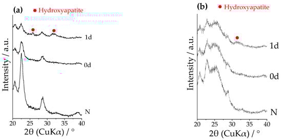 TF-XRD profiles on the surfaces of Samples N: untreated PEEKs (denoted as “N”) and SPA: sulfuric acid + oxygen plasma + modified-SBF-treated PEEKs before (denoted as “0d”) and after immersion in SBF for 1 day (denoted as “1d”) for (a) pure PEEK and (b) 50C-PEEK.