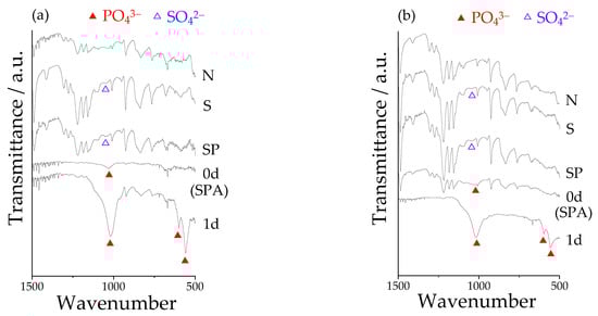 FT-IR spectra on the surface of Samples N: untreated PEEKs, S: sulfuric acid-treated PEEKs, SP: sulfuric acid + oxygen plasma-treated PEEKs, and SPA: sulfuric acid + oxygen plasma + modified-SBF-treated PEEKs before (denoted as “0d”) and after immersion in SBF for 1 day (denoted as “1d”) for (a) pure PEEK and (b) 50C-PEEK.