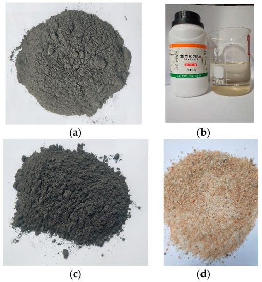 Raw materials for preparing composites: (a) fly ash, (b) NaOH solution, (c) carbide slag, and (d) standard sand.
