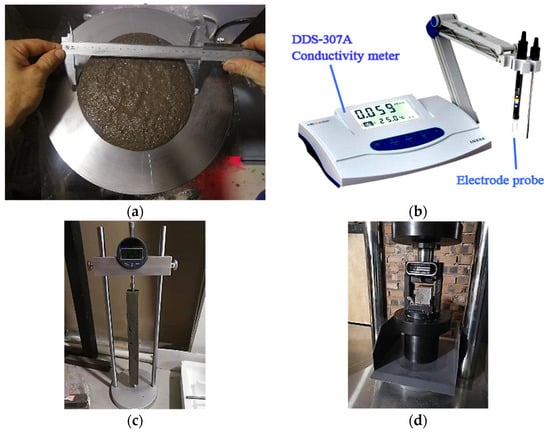 The experiments of (a) fluidity, (b) conductivity, (c) drying shrinkage, and (d) mechanical strength.