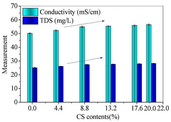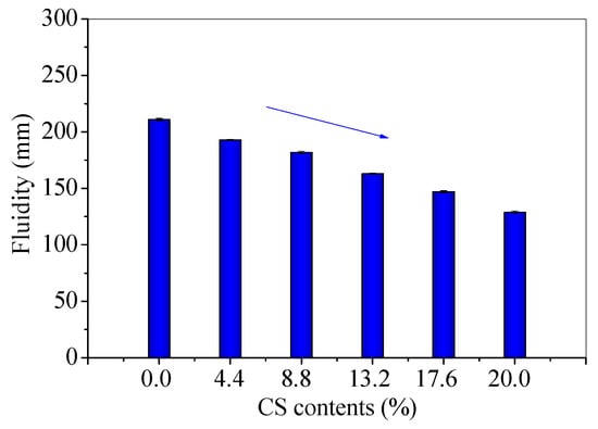 The fluidity, conductivity, and total dissolved solids (TDS) were measured for fresh mixtures to investigate the influence of CS contents. The fluidity results are shown in Figure 3, and the conductivity and TDS results are present in Figure 4.