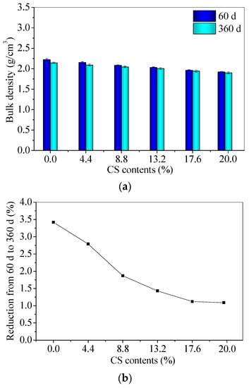 Figure 5 shows the bulk densities of CS–FA–GEO samples. The 60 d bulk densities of samples decrease as the CS contents increase. The bulk density of FC20T25 is 13.46% lower than that of FC0T25. The decreasing bulk densities of the samples may be mainly attributed to the lower specific gravity of CS (than that of FA). The bulk densities of 360 d are lower than those of 60 d, owing to the loss of water. The decrements from 60 d to 360 d decrease as the CS contents increase, which are in the range of 1.09%~3.42%. The previous research reported that the soda residue was utilized as a calcium additive to prepare the FA–GEO mortar. The bulk density of 150 d obtains 2.096 g/cm3 for FA–GEO with a 20.0% soda residue, and the bulk density of mortar with a 20.0% soda residue is slightly lower than that (2.145 g/cm3) of mortar without soda residue [17]. In this paper, CS possesses a similar effect to the soda residue on reducing the bulk density. In summary, the addition of 20.0% CS reduces the bulk density of CS–FA–GEO composites.