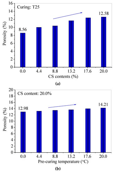 The porosities of CS–FA–GEO samples at 60 d: (a) with different CS contents, and (b) under different pre-curing temperatures.