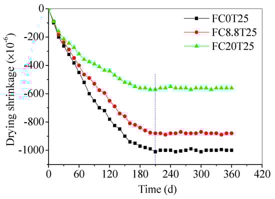 The long-term drying shrinkage values of samples cured for up to 360 d are presented in Figure 8 to explore the effect of CS in the composites. The FC0T25, FC8.8T25, and FC20T25 were chosen to compare drying shrinkage values at different CS contents. It can be seen that the drying shrinkage values of three samples increase with the curing time, and tend to be stable until 210 d. The shrinkage values reach −560 × 10−6 for FC20T25, −880 × 10−6 for FC8.8T25, and −1000 × 10−6 for FC0T25, respectively. This indicates that the lower drying shrinkage of the FA–GEO composite is obtained with an increase in CS content, which displays that the drying shrinkage properties are improved by additional CS.