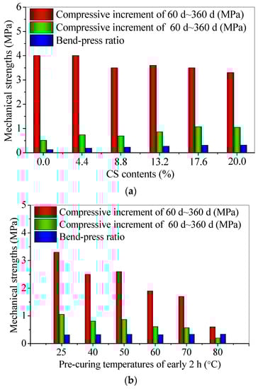 The bend-press ratios and the increments in flexural and compressive strengths of 60 d~360 d for CS–FA–GEO composites: (a) with different CS contents, and (b) at different pre-curing temperatures.