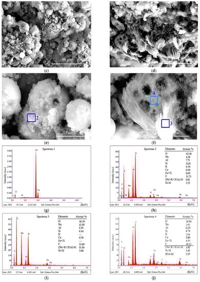 The binder in FC20T25 is prepared using the powder FA, powder CS, and NaOH solution by a L/S ratio of 0.73, which contains 20.0% CS. Compared to the FC0T25, the addition of 20.0% CS improves cementation and increases the compactness of FA–GEO composites (Figure 11c,d). From the SEM images, the microsphere of FA happens to dissolve to a greater extent, owing to the existence of CS (Figure 11e,f). Furthermore, by spectrum 3 and spectrum 4 of EDS testing, it can be seen that the substance at spectrum 3 is determined as Na2CO3 or NaHCO3, which is derived from the surficial pan-alkali (Figure 11f,i). The gel products at spectrum 4 are determined as the mixtures of N–A–S–H and C–S–H gels, which can be judged from the main elemental components with more O, Na, Al, Si, Ca, C, Fe, and Ti, and less Na and K (Figure 11f,j).