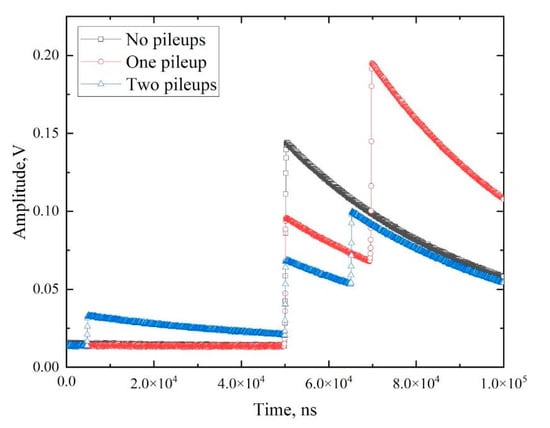 As shown in Figure 1, the signals from the preamplifier can be single and overlapped. The latter case occurs when a detector registers two or more particles during one collection. Such a pileup of signals complicates their further processing, particularly in the estimation of the amplitude and, thus, the photon energy. The software used in the spectrometric module (developed by the Positron Annihilation Group of Charles University, Prague) [34] successfully processes oscillograms without overlapping as well as with one pileup. In the case of three or more overlapping signals, the oscillogram is classified as “bad” and cannot be further processed.