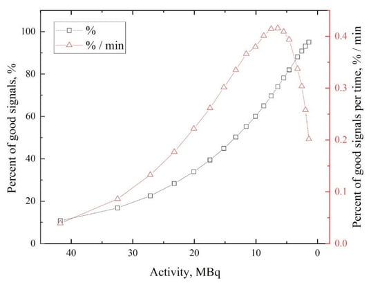 The dependence of the “good” events fraction on the activity of the used isotope is presented in Figure 2.