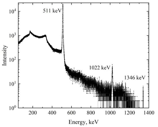 Figure 2 shows that the fraction of “good” signals increases with time (with activity fall). The number of “good” events improves with a slower registered signals count rate (since registering two or more signals at one time window will lead to a pileup) and depends on the ratio of detector deadtime, which is typically inversely proportional to the number of signals per time. However, the time needed for one spectrum collection also increases with time. Taking this into account, the dependence of the number of “good” signals related to the time of spectrum collection on isotope activity is also determined from Figure 2. The maximum value of this function indicates the highest effectiveness of the acquisition process. According to this dependence, the most appropriate activity value of 64Cu isotope for the positron annihilation experiment is in the range of 5–8 MBq. The energy spectrum of γ-radiation of the obtained 64Cu isotope is shown in Figure 3.