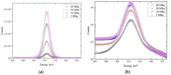 Energy spectra of annihilation line at the different activity levels of the 64Cu isotope: linear scale (a), logarithmic scale (b).