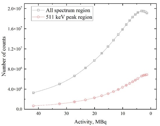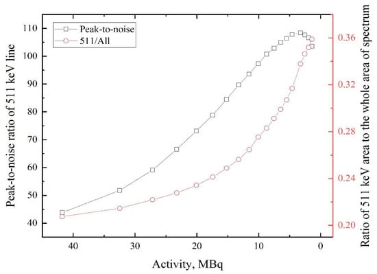 Figure 5 shows that an increase in the number of counts with activity drop characterizes not only the annihilation line but also the whole energy spectrum. This dependency is due to the increasing fraction of “good” signals and decreasing dead time ratio of the detector. A continuation of the experiment (at activity values lower than 1.3 MBq) is assumed to lead to a dramatic drop in intensity, as presented in Figure 5, due to the decay of radioactive 64Cu nuclei in the background of the highest effectiveness of the acquisition process. The start of this point is evident in Figure 5 (black line). The contribution of the 511 keV line in the whole spectrum and a peak-to-noise ratio of this line are characteristics that represent the spectrum quality. The dependences of these characteristics on the source’s activity are presented in Figure 6.