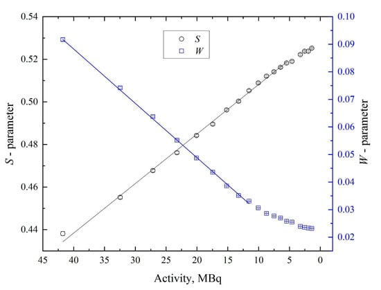 Despite the contribution of the 511 keV line increase with decreasing activity, the peak-to-noise ratio of this line rises until the activity is down to 2–5 MBq. The latter dependence correlates very well with the total number of counts (Figure 5) in the spectrum. The difference between the first and second curves in Figure 6 can be explained by the fact that when the annihilating peak starts to fade, other peaks that are attributed with 64Cu decay start to decrease (1022 keV, 1346 keV). This phenomenon will keep the ratio of 511 keV to all spectrum from decreasing quickly, which is not the case for the peak-to-noise ratio dependence. The dependence of S- and W-parameters on the activity of the obtained source for pristine samples is shown in Figure 7.