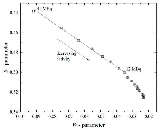 Another parameter, the R-parameter, helps evaluate the predominant type of defects present in the material. This parameter can be calculated as the ratio of the change in S-parameter to the change in W-parameter. Another way to evaluate the defect type is to determine the dependence of S- on W-parameters and to assess the change in slope. Such dependence is presented in Figure 8. The R-parameter is nearly constant at the activity region of 12–41 MBq (the slope is constant).