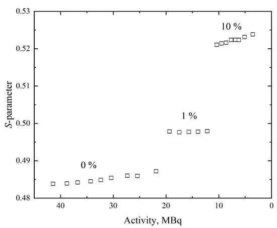 After assessing the dynamics of changes in the spectrometric characteristics of the positron source, its applicability to the study of defects was tested. Hence, samples with different concentrations of defects (dislocations) were prepared (see Section 2.2). For this experiment, 1 mg of copper foil was irradiated in 1013 n/cm2 flux of thermal neutrons for 3 h with a subsequent rest of 1 h out of the neutron field. The resulting activity of the source was approximately 42 MBq. The dependence of the S-parameter on activity value is presented in Figure 9.