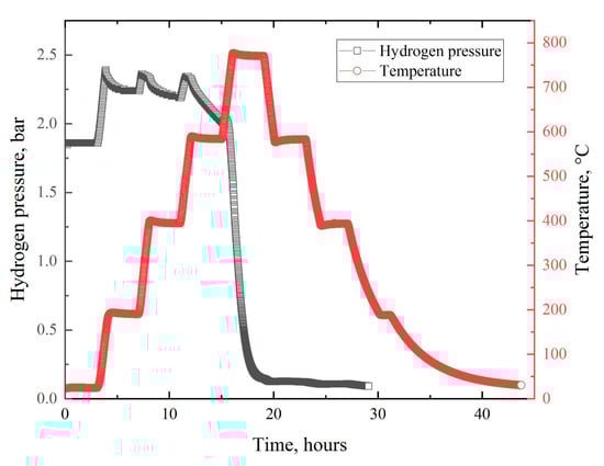 From the presented hydrogen pressure profile, we can see areas of rapid growth associated with the heating stages. However, in the background of these peaks, starting from about 400 °C, the process of slow hydrogen sorption becomes noticeable. This is evidenced by the decreasing height of the pressure peaks associated with heating. In addition, the figure shows that the main sorption stage took place in the temperature range of 630–770 °C and lasted for approximately 2.5 h. Afterward (during the cooling stages), the sorption virtually ceased.